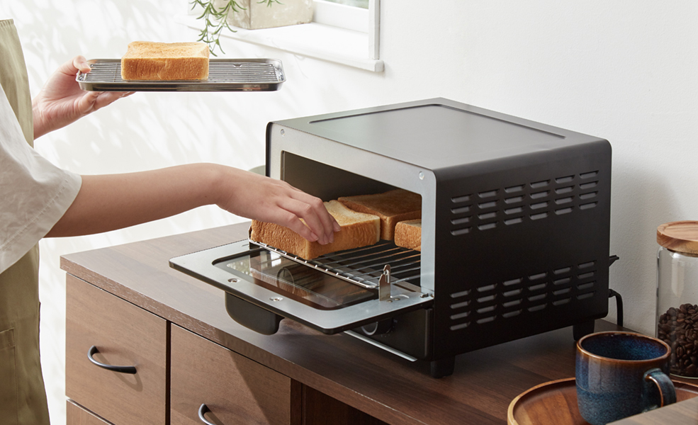 幅33×奥行33cmの省スペース設計ながら、食パン4枚や直径24cmのピザも同時に調理可能。食器棚やカウンター上にも置きやすいサイズです。