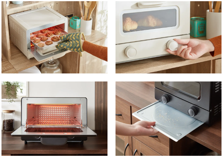焼き網は取り外して丸洗い可能。パンくずトレー付きで庫内のお掃除もラクラク。付属の受け皿はピザやフライドポテトにも便利です。