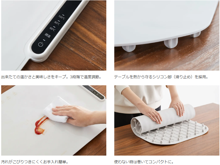 本製品は、60/80/100℃の3段階温度調節と、電源・温度調節に絞ったタッチパネル式のシンプル操作を採用。鍋や大皿料理、朝食、ティータイムなどの食卓シーンはもちろん、冷凍食品の解凍や生地の発酵(60℃)にも活躍します。さらに、ウォーマー部分は柔らかなシリコン製で、使わない時は巻いてコンパクトに収納でき、お手入れもしやすい仕様です。