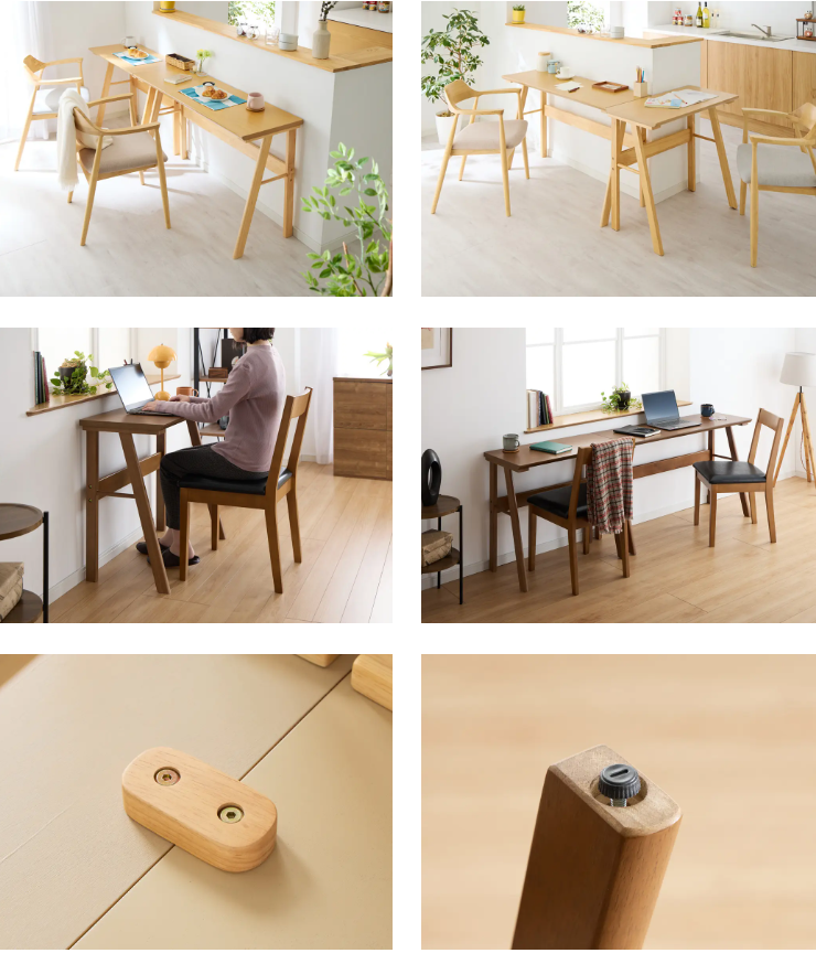 単体では在宅ワーク用デスクとして、複数台では2〜5人掛けのダイニングテーブルとして活用可能。「朝は食事、昼はテレワーク」といった生活シーンにもそのまま対応できます。